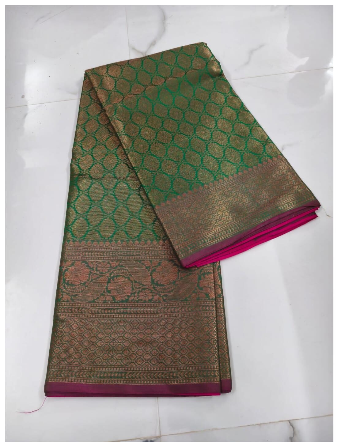 Green body is adorned with zari flower design with pink border, rich pallu and blouse.